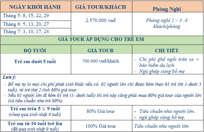 - Trong trường hợp tour có bao gồm vé thắng cảnh mà trẻ em phải mua vé người lớn do lý do chiều cao vượt quá quy định của điểm tham quan thì bố mẹ sẽ phải trả thêm phần chênh lệch vé thắng cảnh trực tiếp cho hướng dẫn viên theo đoàn.