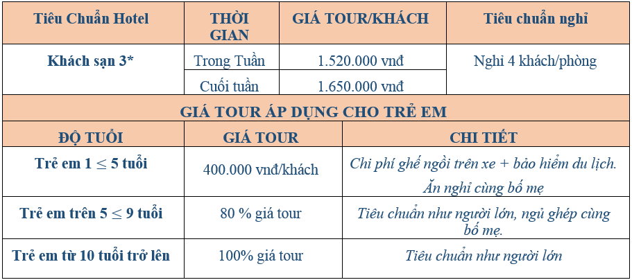- Các chi phí cá nhân chưa bao gồm trong chương trình: Đồ uống trong bữa ăn, giặt là, điện thoại…..