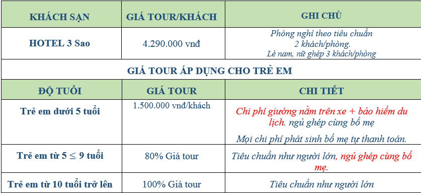 - Các cho phí không nêu trong chương trình: Các chi phí cá nhân, đồ uống phát sinh trong các bữa ăn, điện thoại, vé vui chơi ngoài chương trình ….